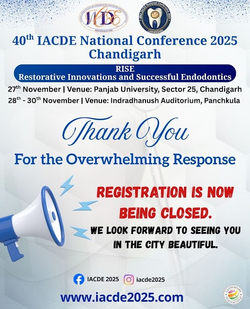 We are pleased to invite you to the 40th IACDE National Conference 2025, a landmark event uniting experts, academicians, and professionals in Conservative Dentistry and Endodontics. This conference promises an enriching experience with advanced research, clinical techniques, and engaging discussions, fostering growth and innovation in our domain.